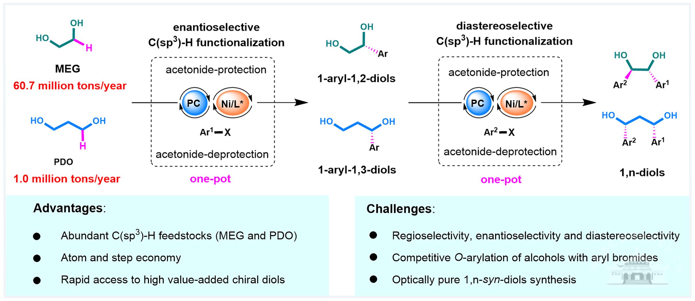 孔望清课题组此前通过光促HAT/镍协同催化的策略,成功实现无导向氧杂环和1-脱氧糖的C(sp3)-H键立体选择性官能团化反应(J. Am. Chem. Soc.2023,145, 5231–5241;Nat. Chem.2024,16, 2054–2065.),基于这一策略,作者设想能否直接使用大宗廉价的化学品乙二醇或1, 3-丙二醇为原料,对其氧邻位C(sp3)-H键进行多次立体选择性官能团化来实现光学纯1, 2-二醇和1, 3-二醇的模块化合成。但是这个策略面临着诸多挑战:1、反应的区域和立体选择性难以控制,目前对于链状醚类化合物的C(sp3)-H键选择性官能团化还鲜有报道;2、双羟基的结构可能会与官能团化试剂发生副反应而使催化剂失活。