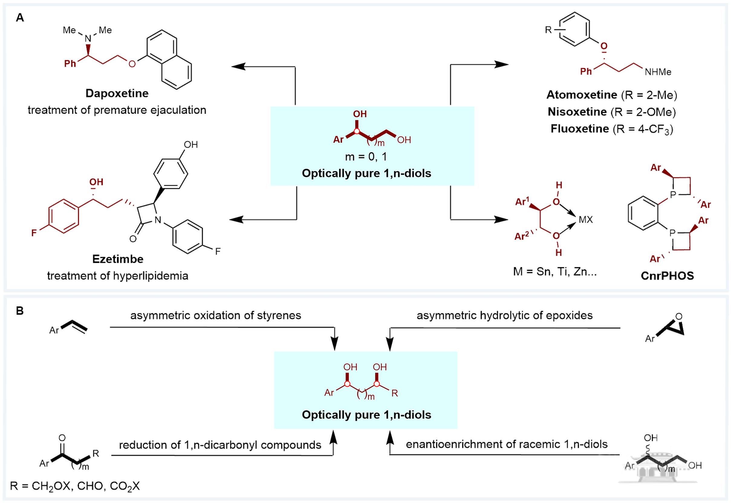 光学纯的1, 2-二醇和1, 3-二醇不仅是众多小分子药物的重要砌块,还是多种不对称催化剂的核心骨架,是一类极具价值的结构。目前已经开发出了众多合成光学纯的1, 2-二醇和1, 3-二醇的方法,但这些方法都无法避免地使用到有毒的金属催化剂或以立体化学纯的烯烃为原料,因此一个成本低廉,选择性优异且绿色的合成光学纯的1, 2-二醇和1, 3-二醇的方法亟待开发。