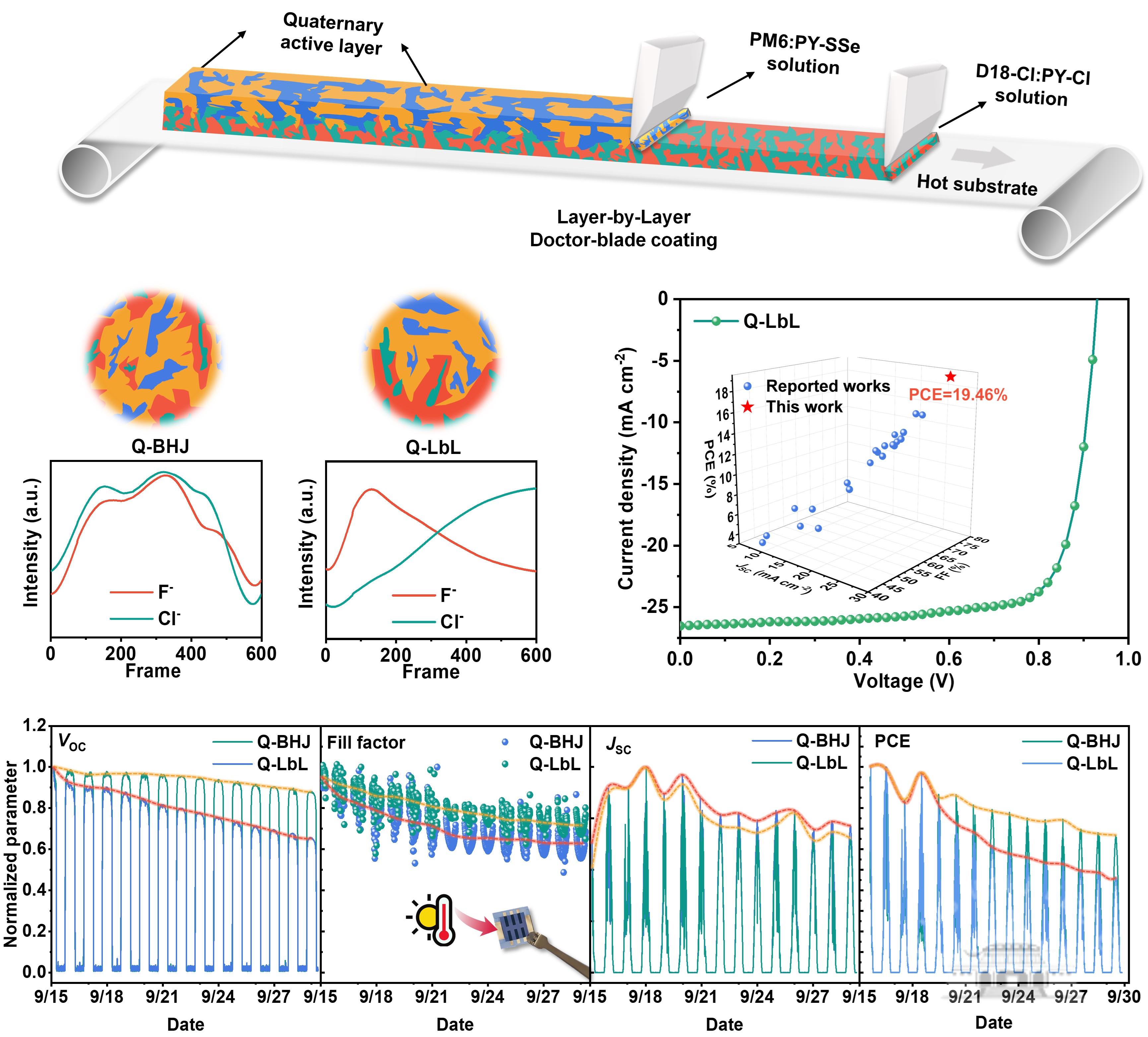 基于此,该课题组提出了双层刮涂制备四元全聚合物器件的策略。选用两个带隙相近但聚集特性不同的二元全聚合物体系,依次刮刀涂布结晶性更强的D18-Cl:PY-Cl亚层和结晶性稍弱的PM6:PY-SSe亚层得到具有类似双层结构的四元全聚合物活性层,既利用了材料的互补吸收带来的短路电流增益,同时又合理控制了聚合物给受体材料的混溶尺度和相分布,从而实现了能量无序和载流子复合的抑制,最终在标准测试条件下取得了19.46%的能量转换效率,该效率为全聚合物体系的最高效率。在武汉大学校园内户外工况条件下(根据ISOS-O2标准)对器件的稳定性进行监测,研究结果表明,逐层刮涂的器件相比四元共混刮涂制备的器件具有显著改善的器件户外稳定性,这与在实验室环境中测得的热稳定性和最大功率输出点追踪-运行稳定性结果一致。这项研究通过多种形貌表征、器件物理表征和稳定性测试分析,关联了聚合物材料聚集特征和器件的光电性能、稳定性,提出了一种协同改善全聚合物多组分太阳能电池效率和稳定性的活性层制备思路。