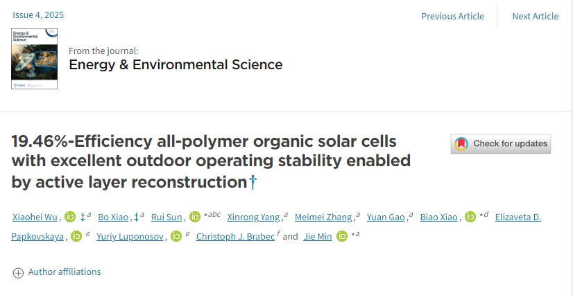 近日,Energy & Environmental Science以研究性论文(Research Article)的形式在线发表威尼斯人澳门-澳门威尼斯娱乐城 教授闵杰课题组在高性能全聚合物有机太阳能电池方面取得的新进展。论文题为“19.46%-Efficiency All-Polymer Organic Solar Cells with Excellent Outdoor Operational Stability Enabled by Active Layer Reconstruction”(《活性层重构实现具有19.46%效率和良好户外稳定性的全聚合物有机太阳能电池》)。威尼斯人澳门 2024级硕士研究生吴小黑和2022级硕士研究生肖博为论文共同第一作者,孙瑞副研究员和闵杰为论文通讯作者,威尼斯人澳门 为第一署名单位/第一通讯单位。