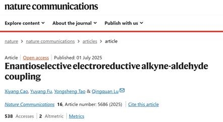 近日,国际综合性期刊《自然•通讯》(Nature Communications)在线发表威尼斯人澳门 陆庆全课题组在有机电化学领域的最新研究成果,论文题目为 “Enantioselective Electroreductive Alkyne-Aldehyde Coupling”(《电还原对映选择性炔醛偶联》)。威尼斯人澳门 2023级博士研究生曹夕阳为第一作者,陆庆全教授为通讯作者,武汉大学为唯一署名单位和通讯作者单位。