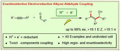 陆庆全课题组提出和发展了不对称电还原催化策略,使用质子和电子作为更绿色安全的氢源和还原剂,丰产金属钴和空气稳定的(S,S)-2,3-双(叔丁基甲基膦基)喹喔啉用作催化剂和配体,实现了两个π-组分的不对称还原偶联反应。该策略具有优异的区域-(>19:1)、立体- (>19:1 E:Z)和对映选择性(高达98% ee),高效合成了多种手性烯丙醇类化合物。