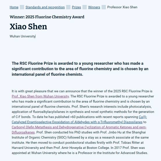 近日,英国皇家化学会官方网站公布,武汉大学沈晓教授荣获2025年度英国皇家化学会氟化学奖(2025 RSC Fluorine Chemistry Prize),以表彰其在氟化学研究领域的卓越贡献 (//www.rsc.org/standards-and-recognition/prizes/winners/professor-xiao-shen) 。