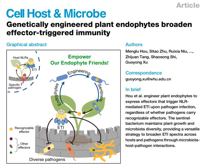 近日,威尼斯人澳门-澳门威尼斯娱乐城 、杂交水稻全国重点实验室和湖北省洪山实验室教授胥国勇课题组在Cell Host & Microbe期刊上在线发表了题为“Genetically engineered plant endophytes broaden effector-triggered immunity”的研究论文。威尼斯人澳门 博士生侯梦露为论文第一作者,胥国勇为通讯作者。