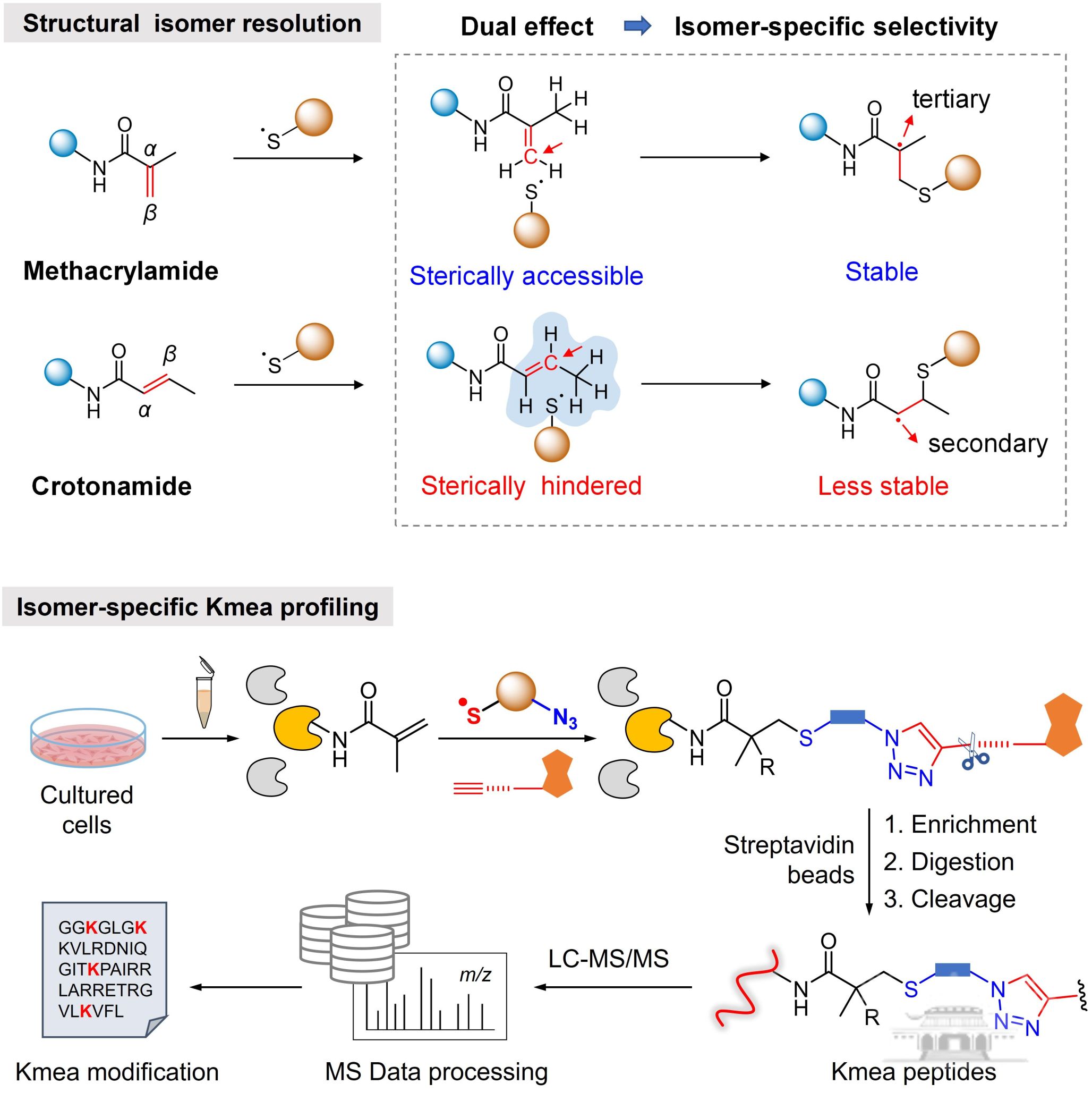 针对这一难题,课题组开发了一种基于“双重化学效应”的创新策略,通过构建新型光催化硫代-迈克尔加成反应体系,利用苯硫自由基对C=C键β碳的立体选择性进攻和自由基中间体稳定性差异,在内烯共存条件下实现了端烯结构的特异性标记、分离富集与质谱分析。研究团队将该策略成功应用于蛋白质α,β-不饱和酮结构异构体翻译后修饰的精准鉴定,在组蛋白、核蛋白和全蛋白组水平鉴定出数十个此前未报道的甲基丙烯酰化修饰蛋白与位点,为深入探索这类新型表观遗传修饰的生物学功能提供了关键工具与新靶点。
