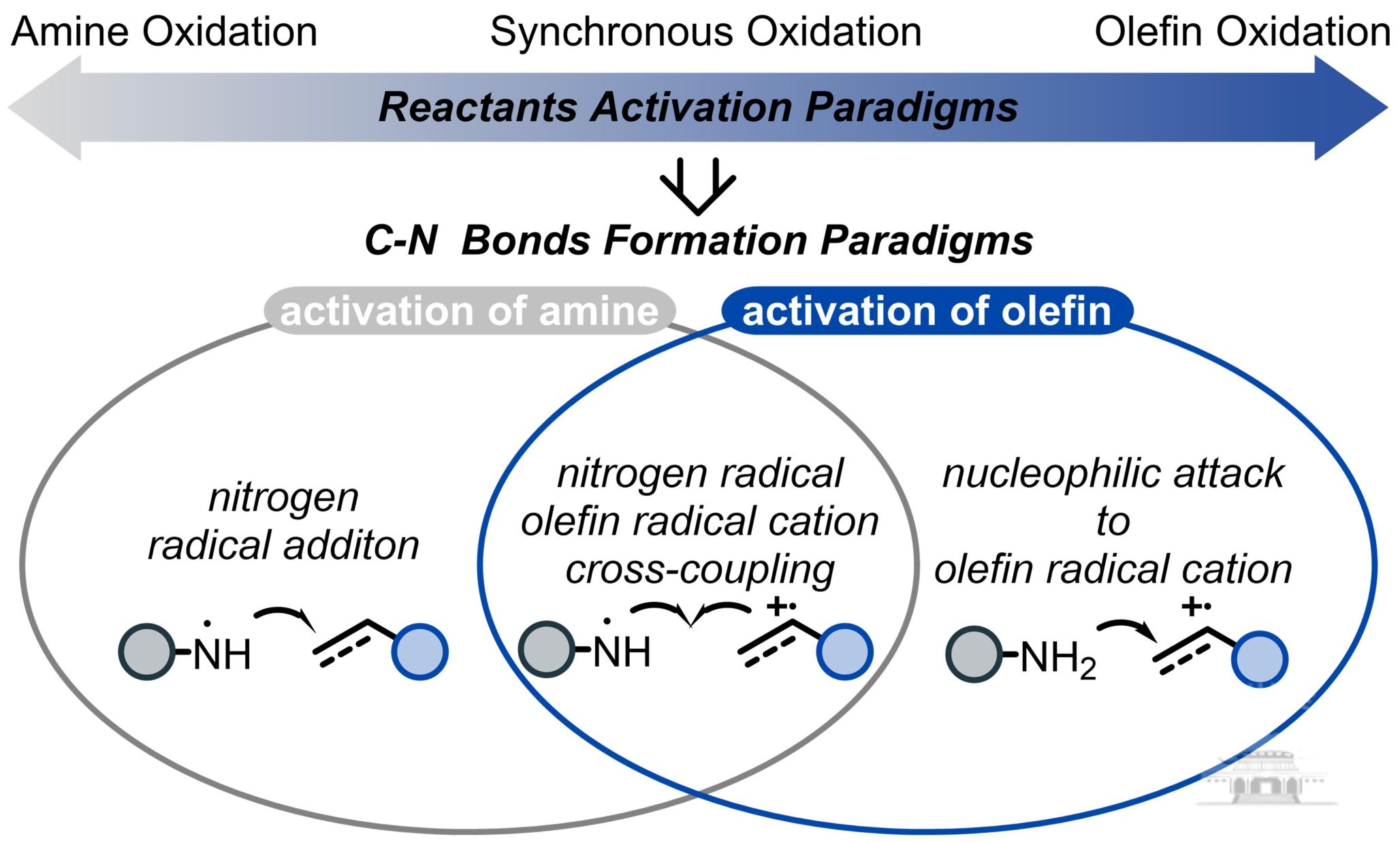 C–N键广泛存在于天然产物、药物分子及功能材料中,其高效、精准构建始终是有机合成研究的重要课题。传统C–N键构建方法通常依赖过渡金属催化剂和强氧化剂,反应条件相对苛刻且可能带来环境负担。相比之下,电化学合成以电子作为“清洁试剂”,可在无需额外化学氧化剂和金属催化剂的条件下实现底物活化,在绿色化学与可持续合成领域展现出重要潜力。尽管近年来电化学烯烃胺化反应取得了一定进展,但不同反应体系所呈现的机理分化、关键中间体的演化过程及反应选择性的决定因素仍缺乏系统认识。