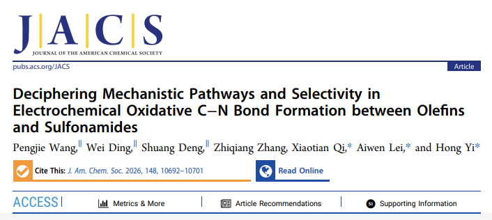 近日,国际化学领域期刊《美国化学会志》(Journal of the American Chemical Society)在线发表威尼斯人澳门-澳门威尼斯娱乐城 研究员易红、教授雷爱文,化学与分子科学学院教授戚孝天研究团队的最新研究成果。该研究围绕电化学条件下烯烃与磺酰胺之间C–N键形成反应的机理分化及选择性来源等关键科学问题,揭示了底物氧化电位差异在反应路径调控中的重要作用,为理解电化学胺化反应机理及发展高效合成体系提供了新的研究思路。