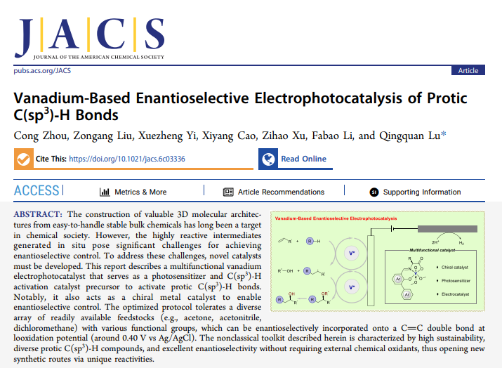 将储量丰富、性质稳定的大宗化工原料直接转化为具有高附加值的精细化学品,一直是学术界和工业界的核心追求。丙酮、乙腈、二氯甲烷等大宗化学品,是基础化工原料与通用溶剂,其分子中广泛存在的质子型C(sp3)-H键,是极具潜力的合成转化位点。基于此,陆庆全团队开发出一种多功能钒基电光催化剂,突破了大宗化工原料中质子型C(sp3)-H键自由基活化与手性控制的核心难题,为廉价大宗化学品向高附加值手性分子的直接转化提供了全新、绿色的合成路径。
