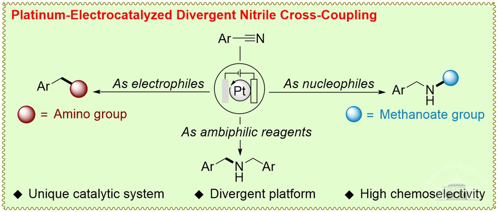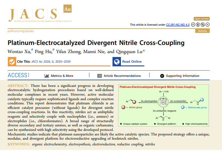 胺作为一类在化学领域中尤为重要的结构单元,广泛存在于具有生物活性的药物分子中。在工业生产中,该类结构单元可作为关键模块广泛应用于聚合物、农用化学品、染料等高价值化学品的合成。因此,相较于其他官能团,胺的合成始终是学术和工业研究中的热点领域。基于此,陆庆全教授团队发展了一种电驱动铂氢催化的芳基腈发散选择性还原偶联策略,有效突破了芳基腈还原过程中发散选择性难以控制的科学问题,为胺及胺类衍生物的合成提供了全新、绿色的合成路径。